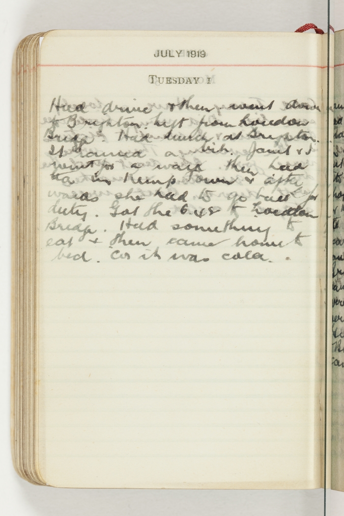Had drive & then went down to Brighton. Left from London Bridge. Had lunch at Brighton. It rained a bit. Janet & I went for a walk & then had tea in Kemp Town & afterwards she had to go back for duty. Got the 6.42 to London Bridge. Had something to eat & then came home to bed. Cos it was cold.