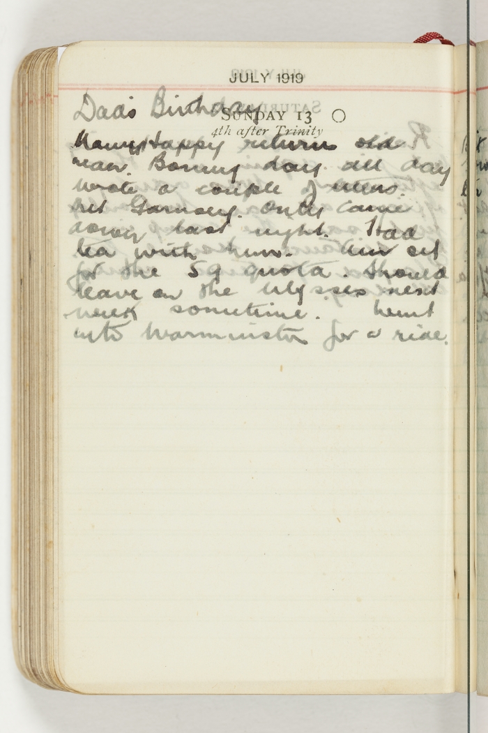 Many Happy Returns old man. Bonny day all day. Wrote a couple of letters. Met Garnsey. only came down last night. Had tea with him. Am set for the 59 quota. Should leave on the Ulysses next week sometime. Went into Warminster for a rise.