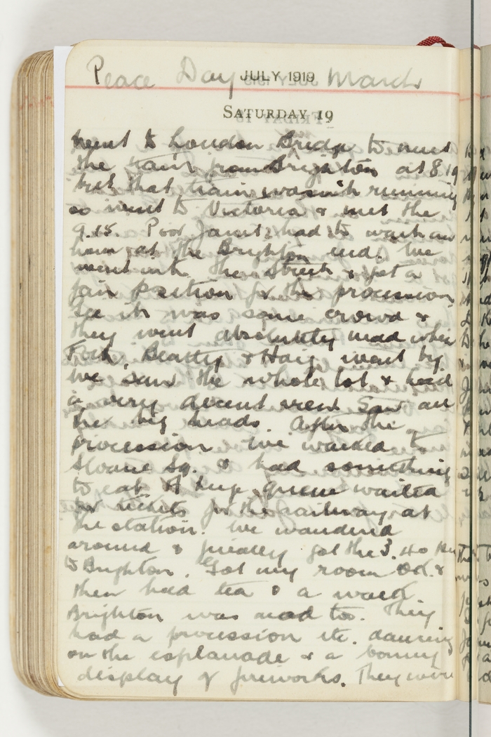 Went to London Bridge to meet the train from Brighton at 8.19 but that train wasn't running so went to Victoria & met the 9.15. Poor Janet had to wait an hour at the Brighton end. We went into the Street & got a fair position for the procession. Gee it was some crowd & they went absolutely mad when Foch, Beatty and Haig went by. We saw the whole lot & had a very decent view. Saw all the big heads. After the procession we walked to Sloan Sq. & had something to eat. A huge queue waited for tickets for the railway at the station. We wandered around & finally got the 3.40 pm to Brighton. Got my room OK & then had tea & a walk. Brighton was mad too. They had a procession etc. dancing on the esplanade & a bonny display of fireworks. They were the best I've ever seen. Gee it was magnificent. It rained just before the display too. It finished at 11.15 pm. Took Janet home after being in a rush for a train & then came back to bed. Gee I'm some tired.