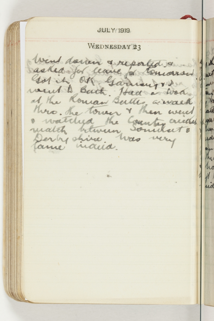 Went down & reported & asked for leave for tomorrow. Got it OK. Garnsey & I went to Bath. Had a look at the Roman Baths, a walk thro. the town & then went & watched the County cricket match between Somerset & Derbyshire. Was very tame indeed.