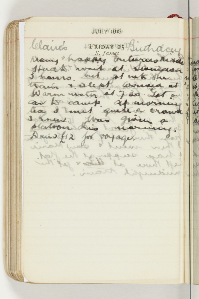 Many happy returns Kiddie. Had to wait at Swindon 3 hrs but got into the train & slept. Arrived at Warminister at 7.30. Got a car to camp. At morning tea I met quite a crowd I knew. Was given a platoon this morning.