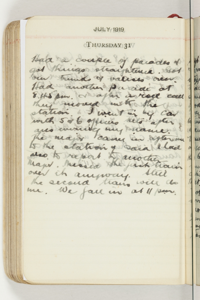 Had a couple of parades & got things straightened. Got our trunks & valises over. Had another parade at 8.45 pm & after a roll call they moved into the station. I went in by car with 5 or 6 officers kits after [indecipherable] wiring my name. The Major came in after me to the station & said I had also to report to another Major. Missed the first train over it anyway. Still the second train will do me. We fall in at 11 pm.
