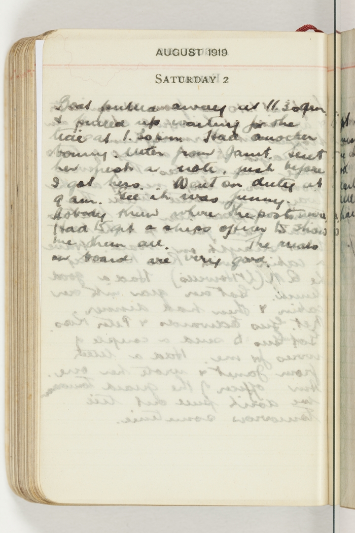 Boat pulled away at 11.30 am & pulled up waiting for the tide at 1.30 pm. Had another bonny letter from Janet. Sent her just a note just before I got hers. Went on duty at 9 am. Gee it was funny. Nobody knew where the posts were. Had to get a ships officer to show me them all. The meals on board are very good.