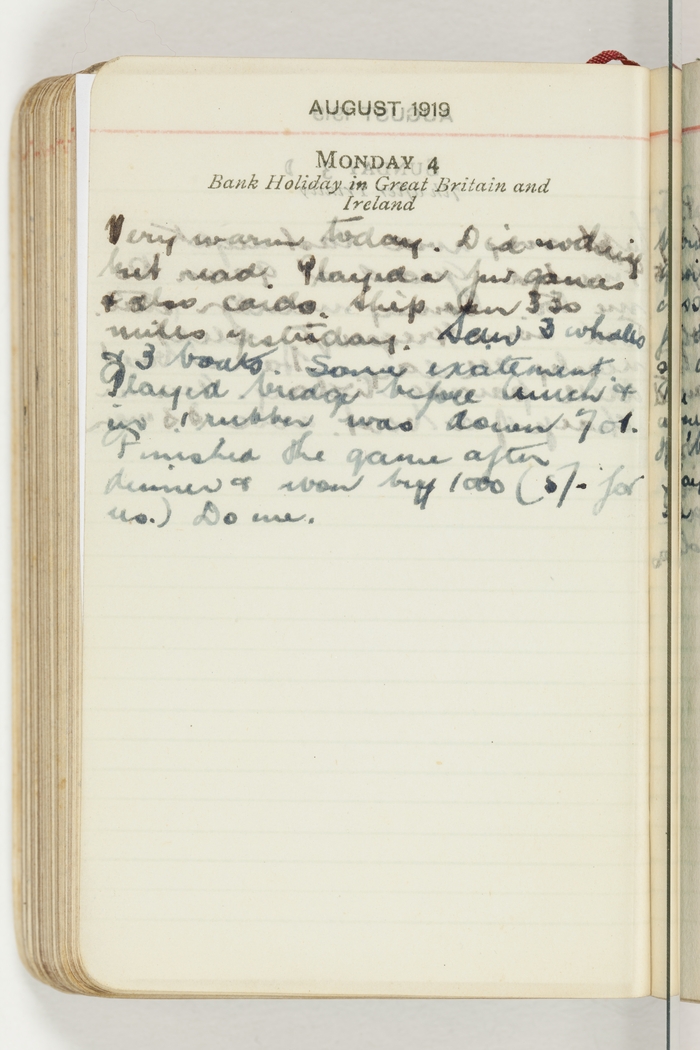 Very warm today. Did nothing but read. Played a few games & also cards. Ship ran 330 miles yesterday. Saw 3 whales & 3 boats. Some excitement. Played bridge before lunch & in one rubber was down 701. Finished the game after dinner & won by 1000 (5/-) for us. Do me.