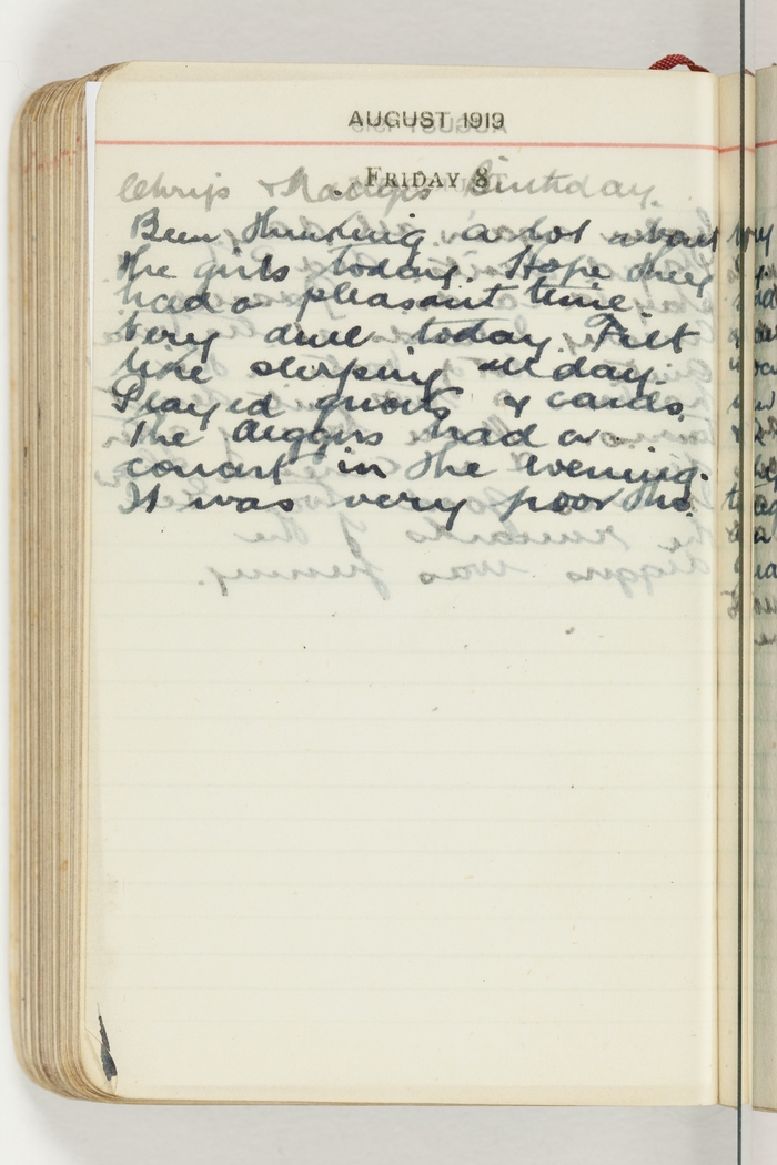 Been thinking a lot about the girls today. Hope they had a pleasant time. Very dull today. Felt like sleeping all day. Played quoits & cards. The diggers had a concert in the evening. It was very poor tho'.