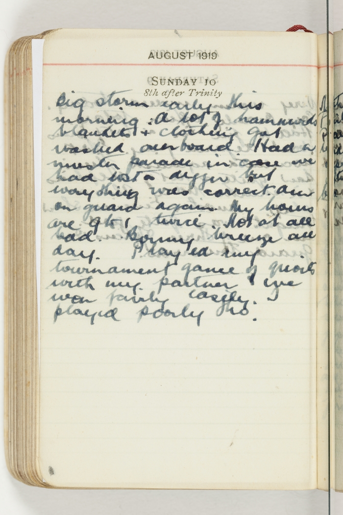 A big storm early this morning. A lot of hammocks. blankets & clothing got washed overboard. Had a muster parade in case we had lost a digger but everything was correct. Am on guard again. My hours are 9 to 1 twice. Not at all bad. Bonny breeze all day. Played my tournament game of quoits with my partner. We won fairly easily. I played poorly tho.