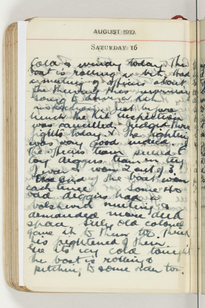 Cold & windy today. The boat is rolling a bit. Had a meeting of officers about the thieving this morning. Going to have a Kit inspection. just before lunch the Kit inspection was cancelled. Judged three fights today & the fighting was very good indeed. The officers team pulled F Coy diggers team in tug of war & won 2 out of 3. The end of the boat won each time. Some 40 odd diggers had a bolshivick meeting & demanded more deck space. Silly old colonel gave it to them too. Think he's frightened of them. Gee its icy cold tonight. The boat is rolling & pitching to some order too.