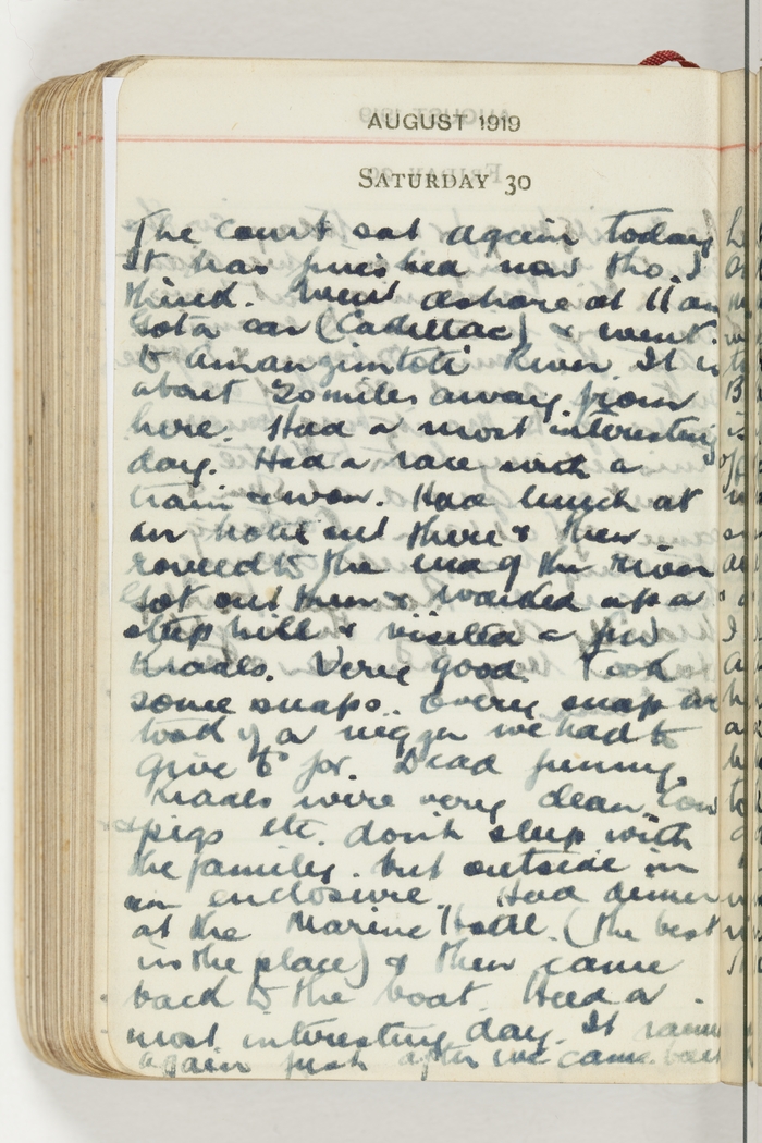 The court sat again today. It has finished now tho' I think. Went ashore at 11 am. Got a car (Cadillac) & went to Amanzimtoti River. It is about 20 miles away from here. Had a most interesting day. Had a race with a train & won. Had lunch at an hotel out there & then rowed to the end of the river. Got out there & walked up a steep hill & visited a few Kraals. Very good. Took some snaps. Every snap we took of a nigger we had to give 6d. Dead funny. Kraals were very clean. Cow & pigs etc. don't sleep with the family but outside in an enclosure. Had dinner at the Marine Hotel (the best in the place) & then came back to the boat. Had a most interesting day. It rained again just after we came back.
