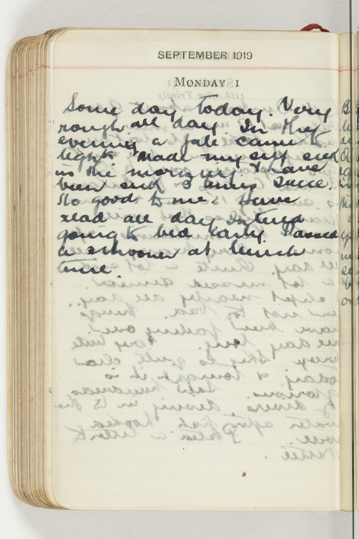 Some day today. Very rough all day. In the evening a gale came to light. Made myself sick in the morning & have been sick 3 times since. No good to me. Have read all day. Intend going to be early. Passed a schooner at lunch time.