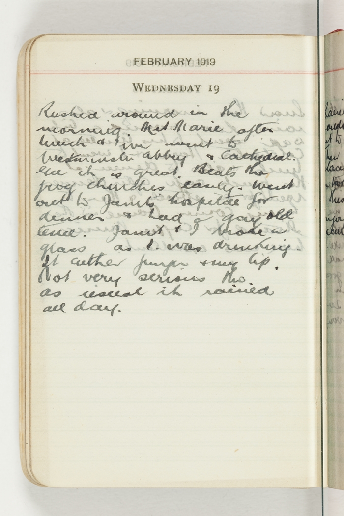 Rushed around in the morning. Met Marie after lunch & we went to Westminster Abbey & Cathedral. Gee it is great. Beats the frog churches easily. Went out to Janet's hospital for dinner & had a gay old time. Janet & I broke a glass as I was drinking. It cut her finger & my lip. Not very serious tho. as usual it rained all day.