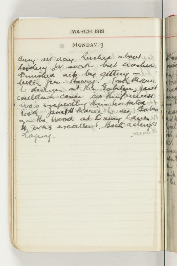 Busy all day. Rushed about looking for work but crashed. finished up by getting a letter from Harry. Took Marie to dinner at the Gobelen. Janet couldn't come cos the Princess was inspecting their Hospital. Took Janet & Marie to see Babes in the Wood at Drury Lane. It was excellent. Both acting & staging.
