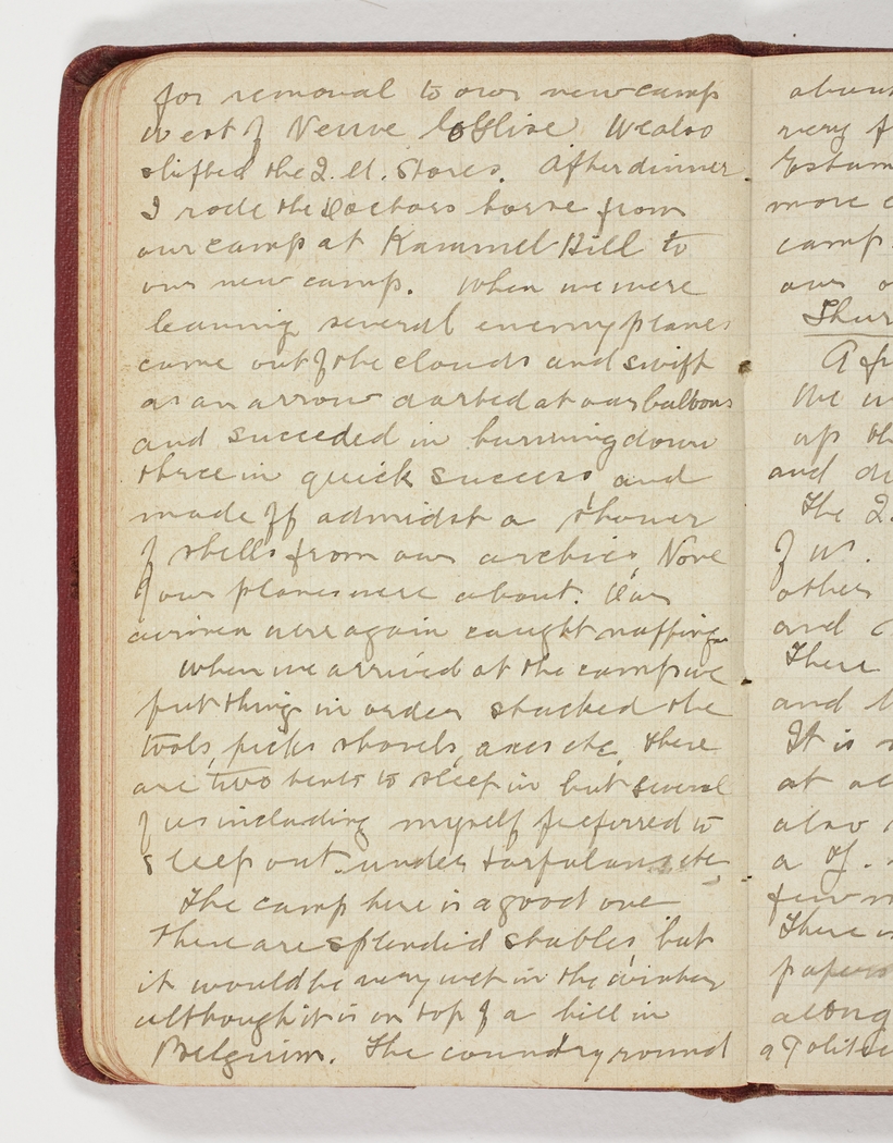 for removal to our new camp West of Neuve Eglise. We also shifted the 2.u stores. After dinner I rode the Doctors horse from our camp at Kammel Hill to our new camp. When we were leaving several enemy planes came out of the clouds and swift as an arrow darted at our baloons and succeded in burning down three in quick success, and made off admidst a shower of shells from our archies. None of our planes were about. Our airmen were again caught napping.