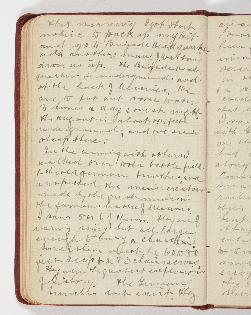 This morning I got short notice to pack up my kit and go to Brigade Headquarters with another man. J. Watson drove us up. The Brigade Headquarters is underground and at the back of Messines. We are to put out some water 3 times a day & one at night. The dugout is about 45 feet underground, and we are to sleep there.