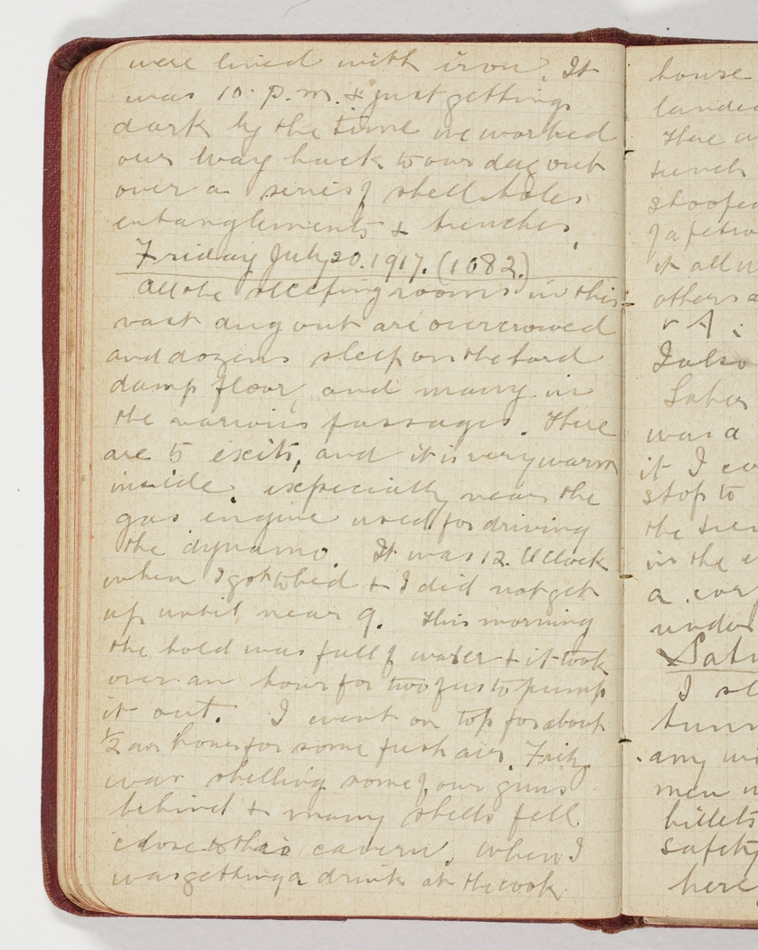 All the sleeping rooms in this vast dug out are overcrowded and dozens sleep on the hard damp floor, and many use the various passages. There are 5 exits, and it is very warm inside, especially near the gas engine used for driving the dynamo. It was 12 Oclock when I got to bed & I did not get up until near 9. This morning the hold was full of water & it took over an hour for two of us to pump it out. I went up on top for about ½ an hour for some fresh air. Fritz was shelling some of our guns behind & many shells fell close to this cavern. When I was getting a drink at the cook house at no 9 exit a shell landed within 10 yards of me. There were the two walls of the trench between me & it, & I was stooped trying to get some water out of a petrol tin when it went off, so it all went over me. There were others about & none were hurt.
