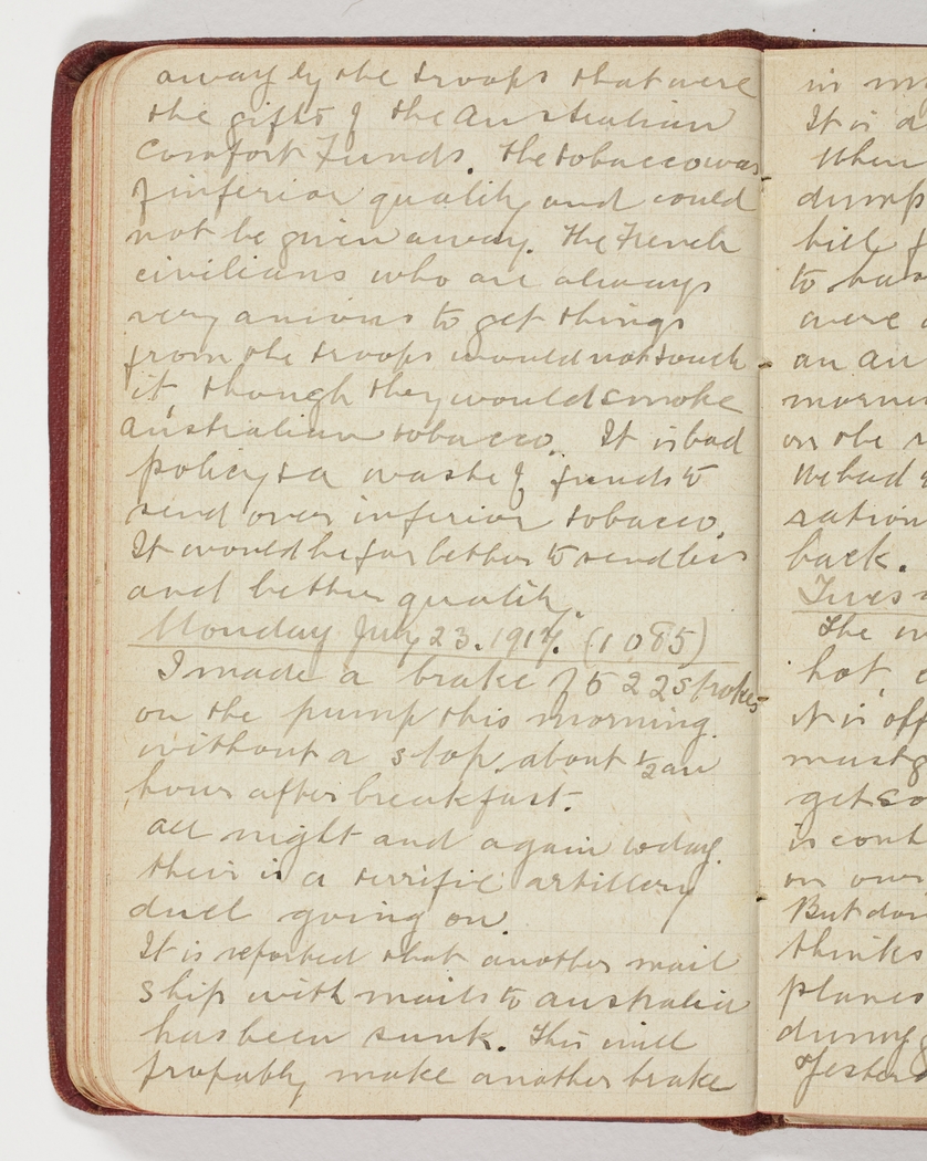 away by the troops that are the gift of Australian Comfort Funds. The tobacco was of inferior quality and could not be given away. The French civilians who are always very anxious to get things from the troops would not touch it, though they would smoke Australian tobacco. It is bad policy & a waste of funds to send