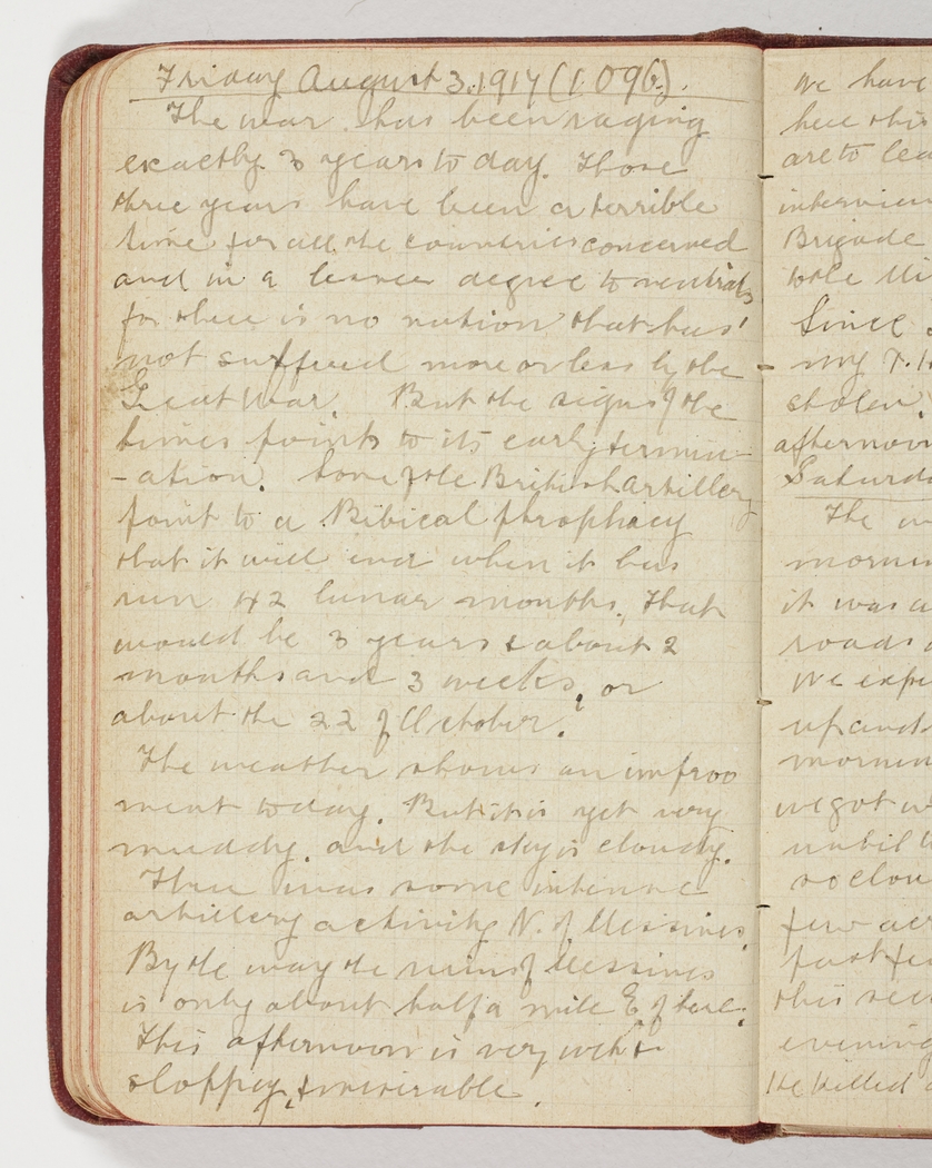 The war has been raging exactly 3 years today. Those three years have been a terrible time for all the countries concerned and in a lesser degree to neutrals, for there is no nation that has not suffered more or less by the Great War. But the signs of the times points to its early termination. Some of the British artillery point to a Biblical phrophecy that it will end when it has run 42 lunar months. That would be 3 years & about 2 months and 3 weeks, or about 22 of October.