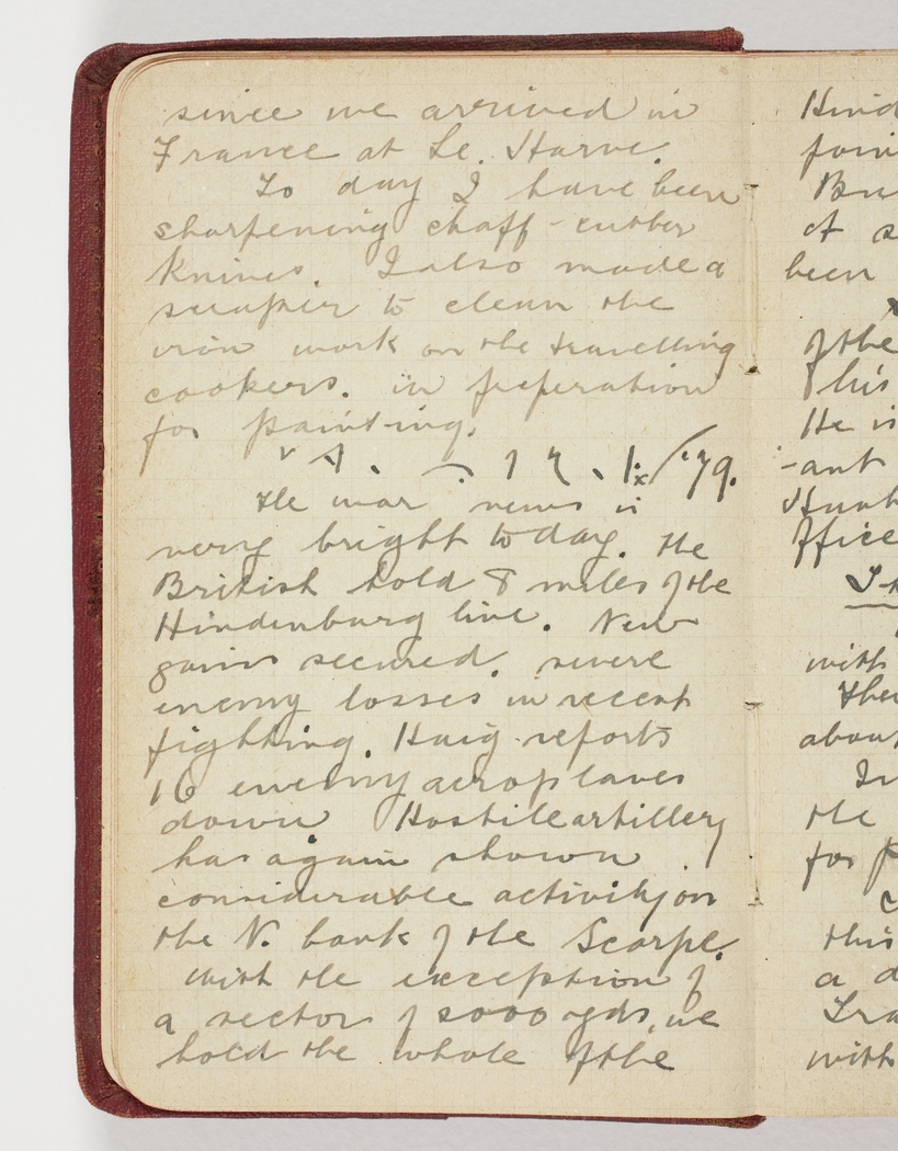 The war news is very bright today. The British hold 8 miles of the Hindenburg line. New gains secured severe enemy losses in recent fighting. Haig reports 16 enemy aeroplanes down. Hostile artillery has again shown considerable activity on the N. bank of the Scarpe, with the exception of a sector of 2000 yds. We hold the whole of the Hindenburg line from a point one mile E. of Bullecourt to Arras. A successful raid has been carried out near Loas.