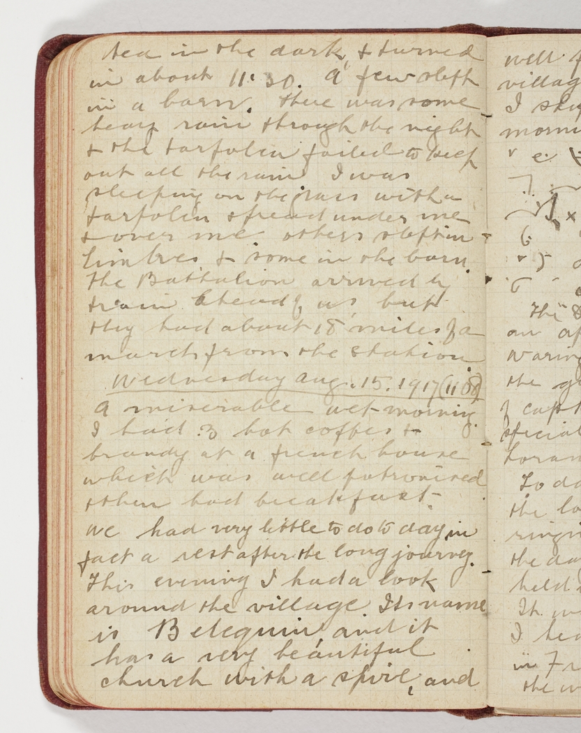 tea in the dark, & turned in about 11.30. A few slept in a barn. There was some heavy rain through the night & the tarpolin failed to keep out all the rain I was sleeping on the grass with a tarpolin spread under me & over me, others slept in limbers & some in the barn. The Battalion arrived by train ahead of us, but they had about 18 miles of a march from the station.