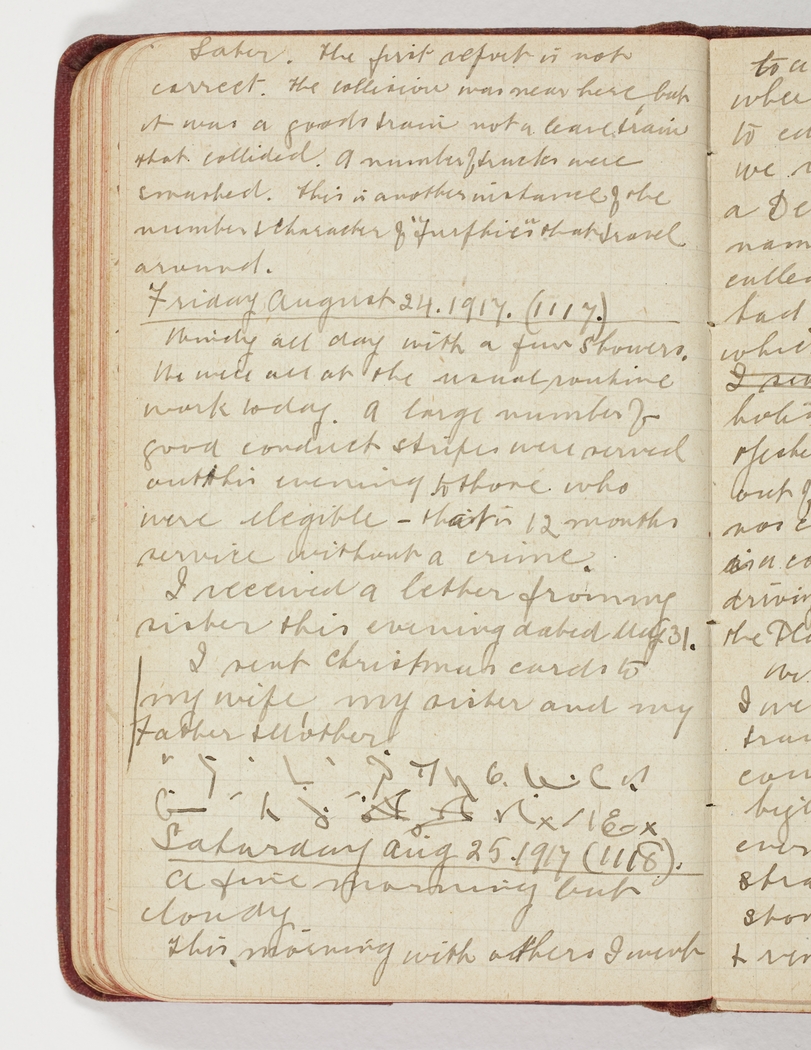 Windy all day with a few showers. We were all at the usual routine work today. A large number of good conduct stripes were served out this evening to those who were elegible- that is 12 months service without a crime.