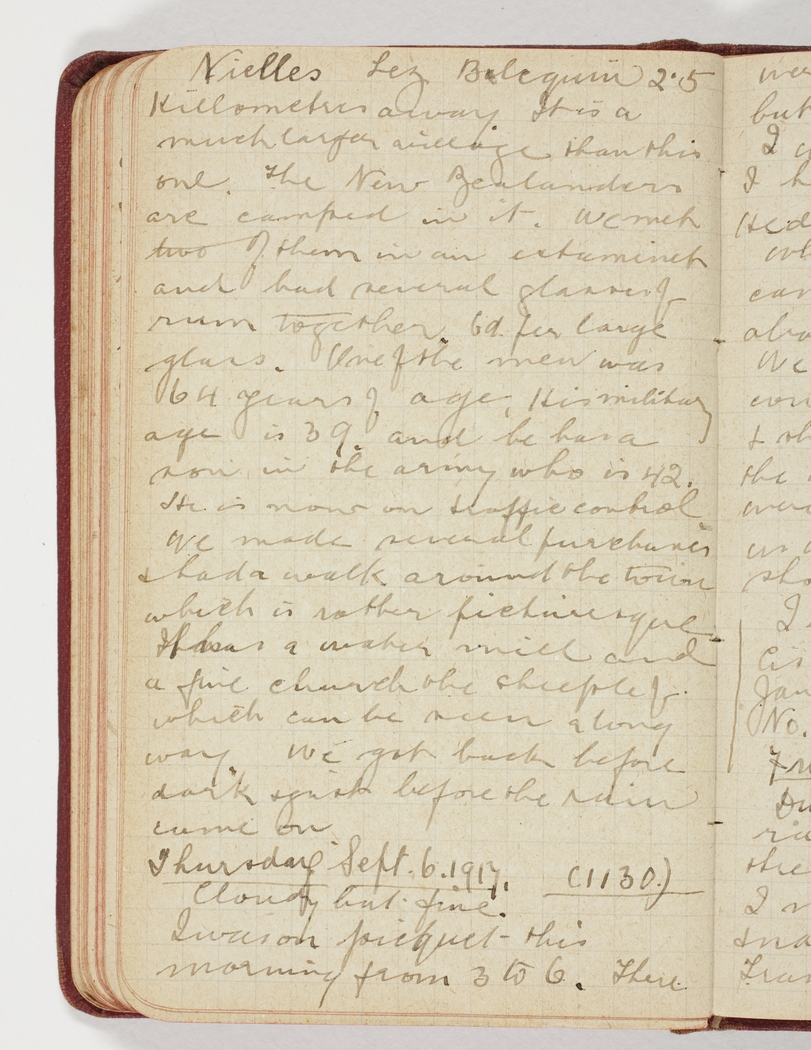 Nielles Lez Balequin 2.5 killometres away. It is a much larger village than this one. The New Zealanders are camped in it. We met two of them in an estaminet and had several glasses of rum together, 6d. per large glass. One of the men was 64 years of age. His military age is 39, and he has a son in the army who is 42. He is now on traffic control.