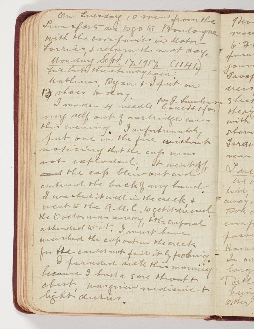 I made 4 needle boxes for J. Lawless & 1 for my self out of cartridge cases this evening. I unfortunately put one in the fire without noticing that the cap was not exploded. It went off and the cap blew out and entered the back of my hand. I washed it well in the creek, & went to the A.M.C. to get it dressed, the Doctor was away, & the corporal attended to it. I must have washed the cap out in the creek for the [corporal] could not find it by probing.