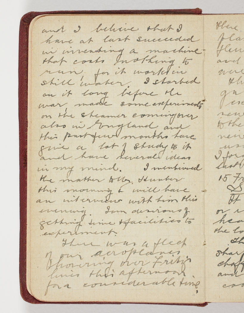 and I believe that I have at last succeeded in inventing a machine that costs nothing to run, for it works in still water. I started on it long before the war, made some experiments on the steamer coming over also in England and this past few months have give a lot of study to it and have several ideas in my mind. I mentioned the matter to Mr. Hunter this morning ∧ will have an interview with him this evening. I am desirous of getting time ∧ facilities to experiment.