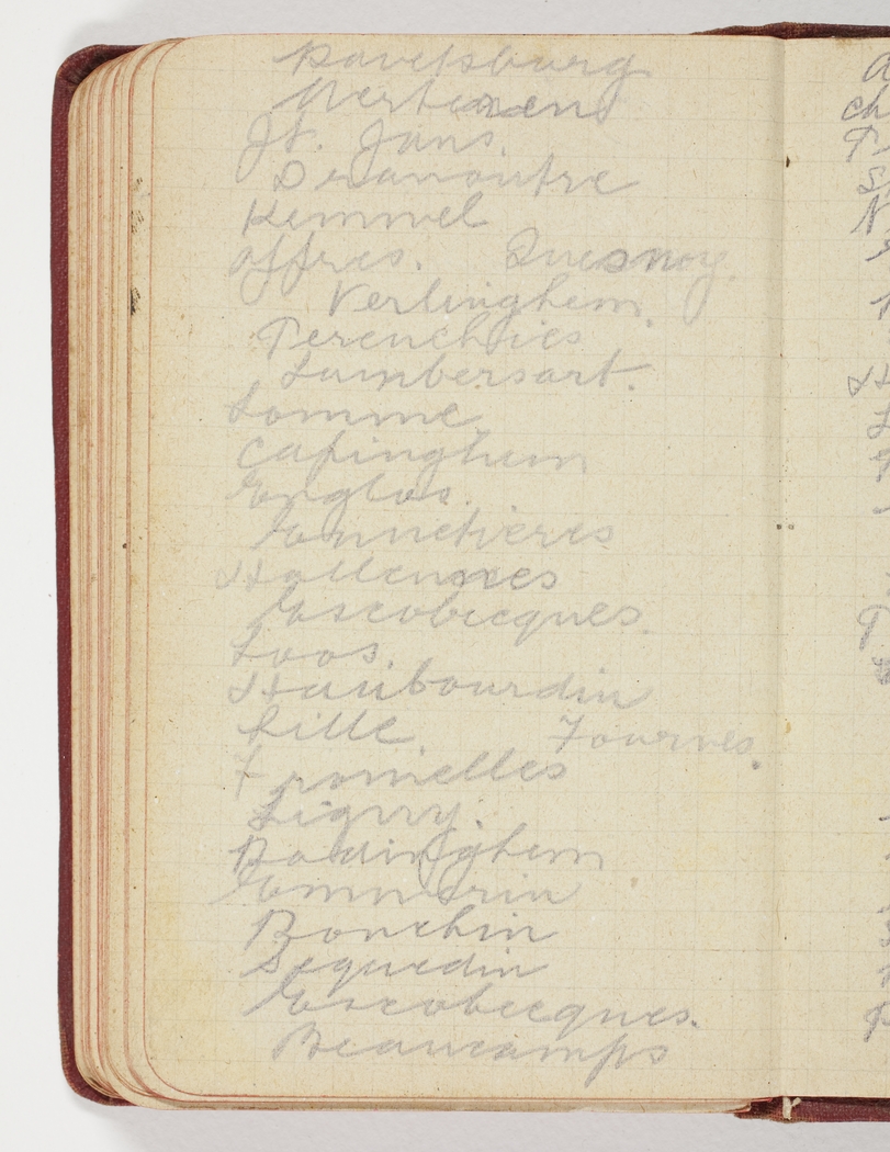 Ravelsburg Mertenen Jt.Jans Dramoutre Kemmel Affres Quesnoy Verlinghem Perenehies Larnbersart Somme Capinghem Englos Ennetieres Hallennes Miscobecques Loos Haribourdin Lille Fournes Fromelles Ligrry Radinghem Emnerin Ponchin Suquedin Escobecques Beaucamps Armentieres Chapelle d'Armentieres Ploegsteert Steenwerck Nieppe Erquingham Bois Grenier Frelinghien Houplines L.Epinette Rue du Bois Messines Warneton River Lys Pont- Rouge Le Touquet Le Gheer Neuve Eglise Wulverghem Crosse de Bal Rue de Lys Estaires Sailly sur la lys [indecipherable] Pt Mortier Bailleul.