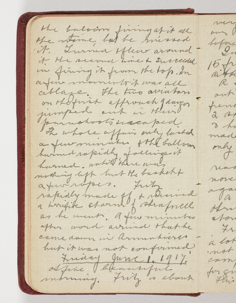 the baloon firing at it all the time, but he missed it. Turned & flew around it, the second time he succeeded in firing it from the top. In a few moments it was ablaze. The two aviators on the first approach of danger jumped out in their parachoots & escaped.