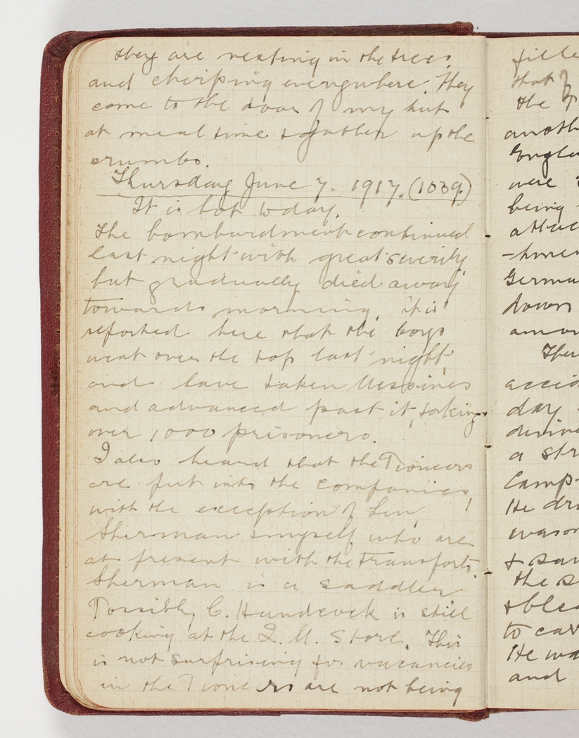 The bombardment continued last night with great severity, but gradually died away towards morning. It is reported here that the boys went over the top last night, and have taken Messines and advanced past it, taking over 1000 prisoners.