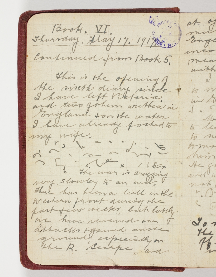 This is the opening of the sixth diary since I have left Victoria, and two of them written in England & on the water I have already posted to my wife.