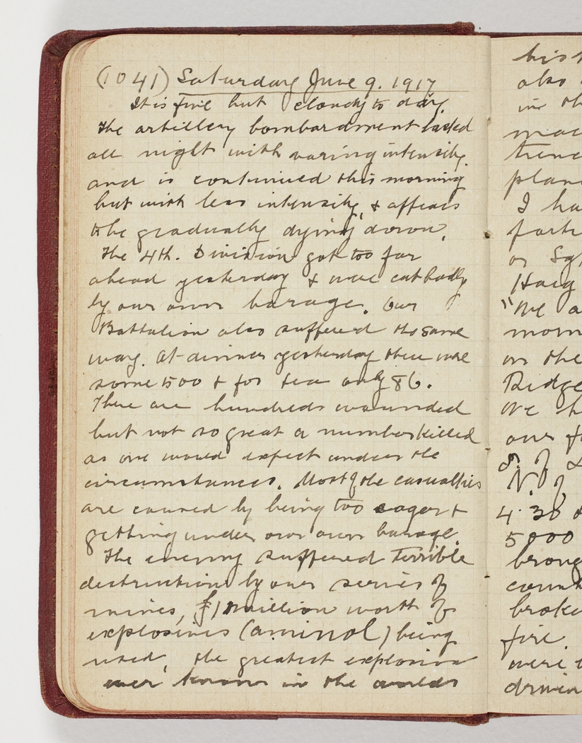 The enemy suffered terrible destruction by our series of mines, £ 1 million worth of explosives (aminol) being used, the greatest explosion ever known in the areas history. Our aeroplanes also did terrible execution in the trenches, pouring machine guns bullets in the trenches, engaging hostile planes, & dropping bombs.
