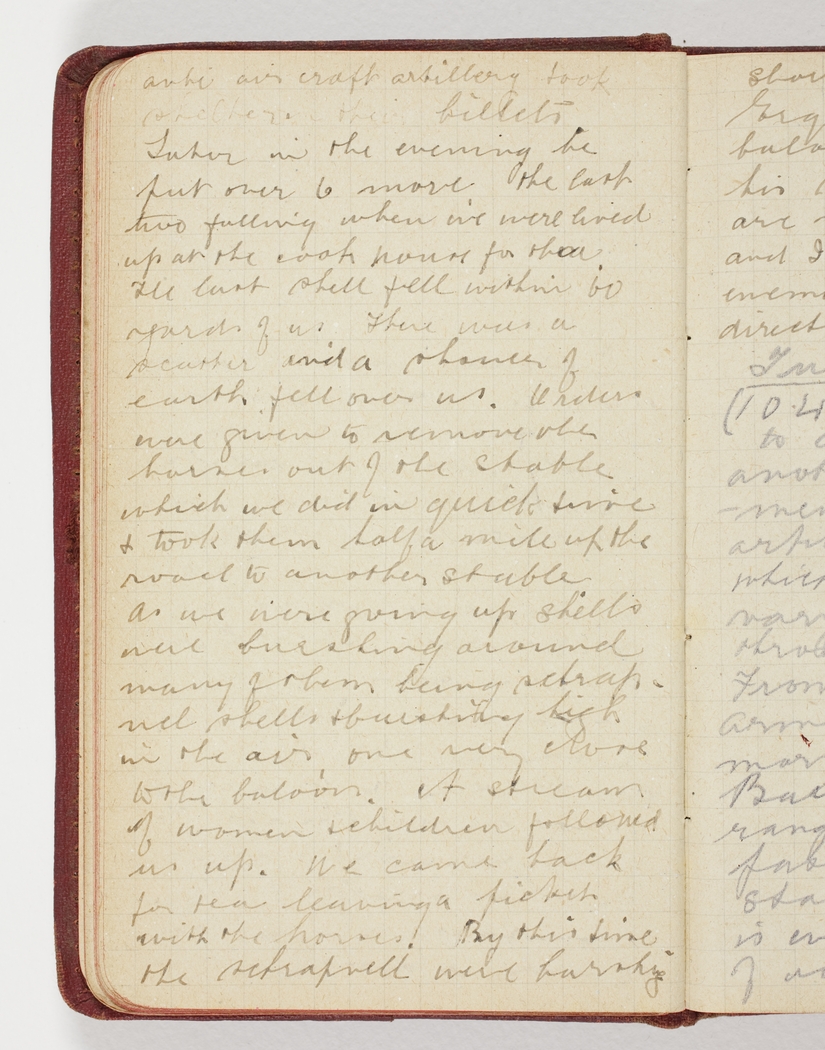 The last shell fell within 60 yards of us. There was a scatter and a shower of earth fell over us. Orders were given to remove all horses out of the stables which we did in quick time & took them half a mile up the road to another stable.