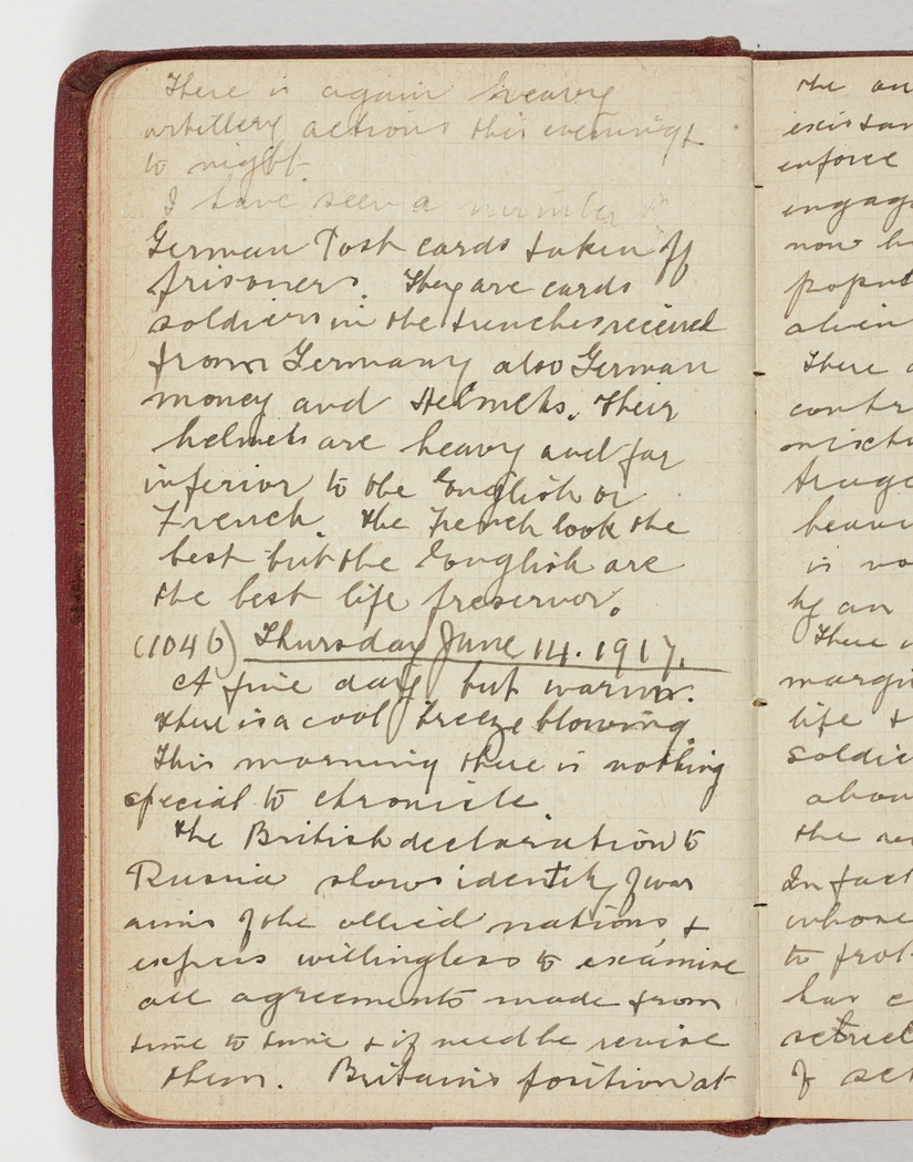 I have seen a number of German Post cards taken off prisoners. They are cards soldiers in the trenches received from Germany also German money and Helmets. Their helmets are heavy and far inferior to the English or French. The French look the best but the English are the best life preserver.