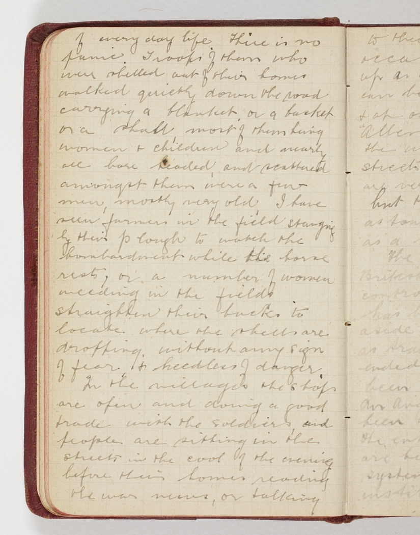 of every day life. There is no panic. Troops of them who were shelled out of their homes walked quickly down the road carrying a blanket, or a basket or a shall, most of them being women &amp children and nearly all bare headed, and scattered amongst them were few men, mostly very old, I have seen farmers in the field stanging by their plough to watch the bombardment while the horse rests, or a number of women weeding in the fields straightening their backs to locate where the shells are dropping, without any sign of fear, &amp heedless of danger.