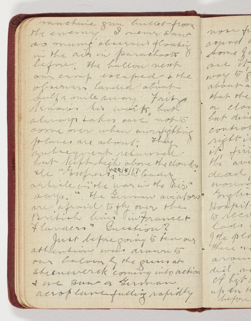 machine gun bullet from the enemy. I never saw so many observers floating in the air in parachoots before. The ballon next our camp escaped & the observers landed about half a mile away. Fritz knows his work, but always takes care not to come over when any fighting planes are about. They subsequent returned but kept high above the clouds.