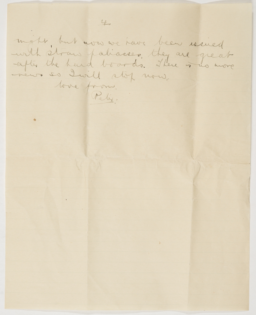 night, but now we have been issued with straw paliasses, they are great after the hard boards. There is no more news so I will stop now.