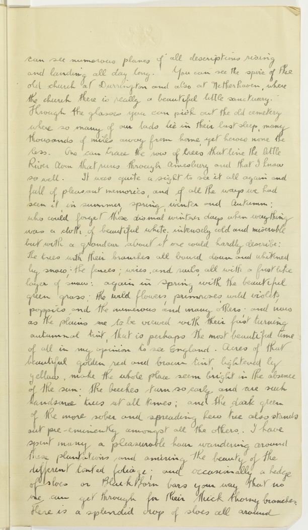 can see numerous planes of all descriptions rising and landing all day long. You can see the spire of the old church of Durrington and also at Netherhaven, where the church there is really a beautiful little sanctuary. Through the glasses you can pick out the old cemetery where so many of our lads lie in their last sleep, many thousands of miles away from home, yet heroes none the less. One can trace the row of trees that line the little River Avon that runs through Amesbury and that I know so well. It was quite a sight to see it all again and full of pleasant memories, and of all the ways we had seen it, in summer, spring, winter and Autumn: who could forget those dismal winter days when everything was a cloth of beautiful white, intensely cold and miserable but with a grandeur about it one could hardly describe: The trees with their branches all bowed down and whitened by snow; the fences; wires, and rails all with a frost like layer of snow: again in Spring with the beatiful green grass; the wild flowers, primroses, wild violets, poppies, and the numerous and many others; and now as the plains are to be viewed with their fast turning autumnal tint that is perhaps the most beautiful time of all in my opinion to see England. Acres of that beautiful golden red and brown tint lightened by yellow, make the whole place seem bright in the absence of the sun; The beeches turn so early and are such handsome trees at all times; and the dark green of the more sober and spreading Yew tree also stands out pre-eminently amongst all the others. I have spent many a pleasurable hour wandering around these plantations, and amiring the beauty of the different tinted foliage; and occasionally a hedge of sloes or Blackthorn bars your way that no one can get through for their thick thorny branches. There is a splendid crop of sloes all around