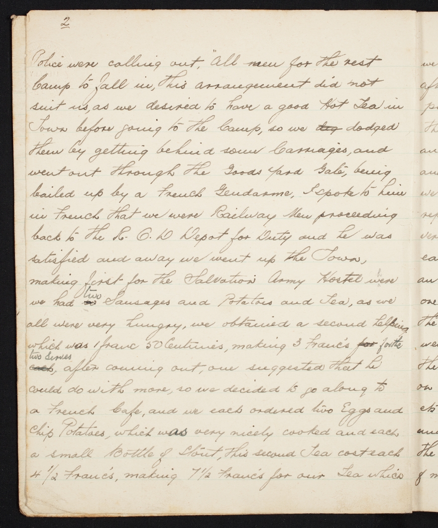 Police were calling out, "All men for the rest Camp to fall in, this arrangement did not suit us, as we desired to have a good Hot Tea in Town before going to the Camp, so we de dodged them by getting behind some carriages, and went out through the Goods Yard Gate, being bailed up by a French Gendarme. I spoke to him in French that we were Railway Men proceeding back to the R.O.D Depot for duty and he was satisfied and away we went up the town, making first for the Salvation Army Hostel where we had two Sausages and Potatoes and Tea, as we all were very hungry, we obtained a second helping which was 1 franc 50 centimes, making 3 francs for for the each two serves, after coming out, one suggested that he could do with more, so we decided to go along to a French Cafe, and we each ordered two Eggs and chip Potatoes, which was very nicely cooked and each a small Bottle of Stout, this second Tea cost each 4 ½ Franc's making 7 ½ Franc's for our Tea which