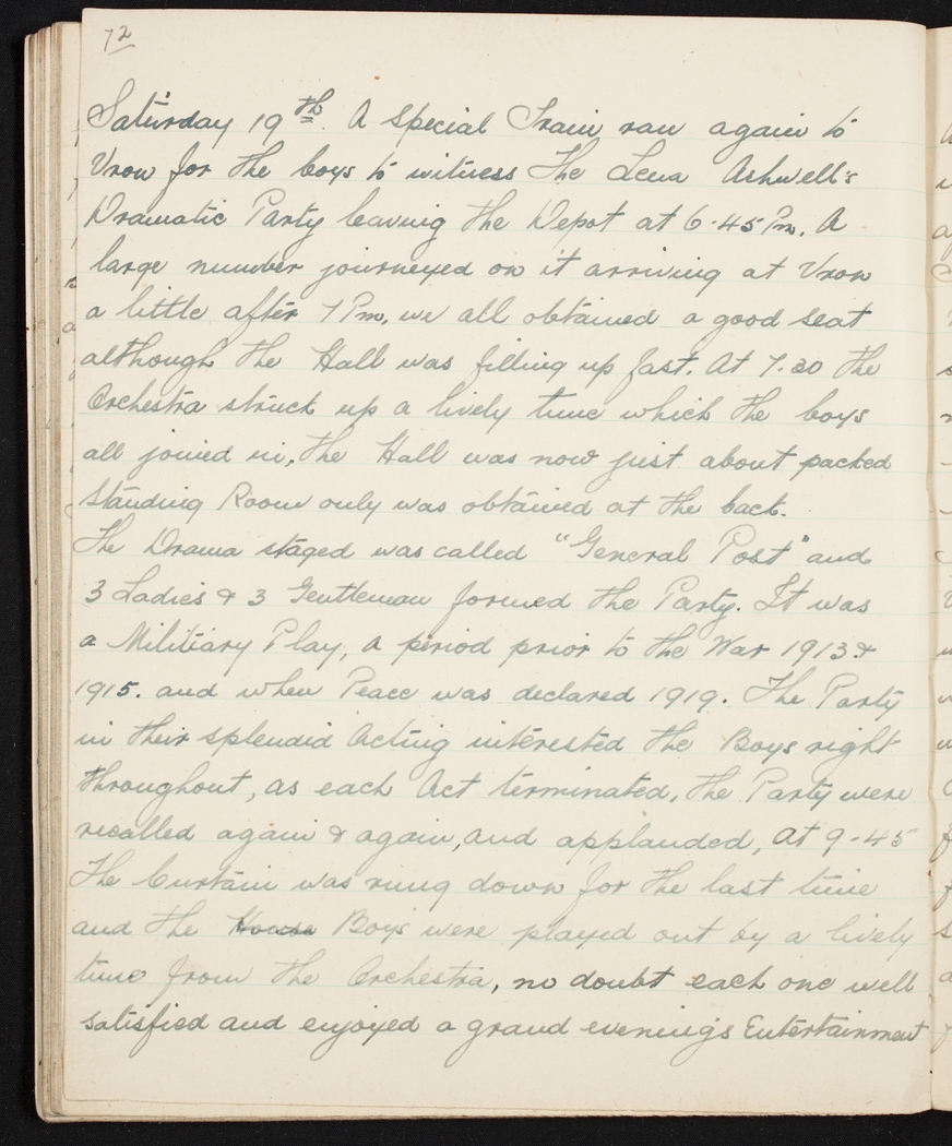 Saturday 19th. A Special Train ran again to Vron for the boys to witness The Lena Ashwell's Dramatic Party leaving the Depot at 6.45Pm. A large number journeyed on it arriving at Vron a little after 7 P m, we all obtained a good seat although the Hall was filling up fast. At 7.30 the Orchestra struck up a lively tune which the boys all joined in. The Hall was now just about packed Standing Room only was obtained at the back. The Drama staged was called "General Post" and 3 Ladies & 3 Gentleman formed the Party. It was a Militiary Play, a period prior to the War 1913&1915. and when Peace was declared 1919. The Party in their splendid acting interested the Boys right throughout, as each Act terminated, the Party were recalled again & again, and applauded, At 9-45 The Curtain was rung down for the last time and the House Boys were played out by a lively tune from the Orchestra, no doubt each one well satisfied and enjoyed a grand evening's Entertainment.