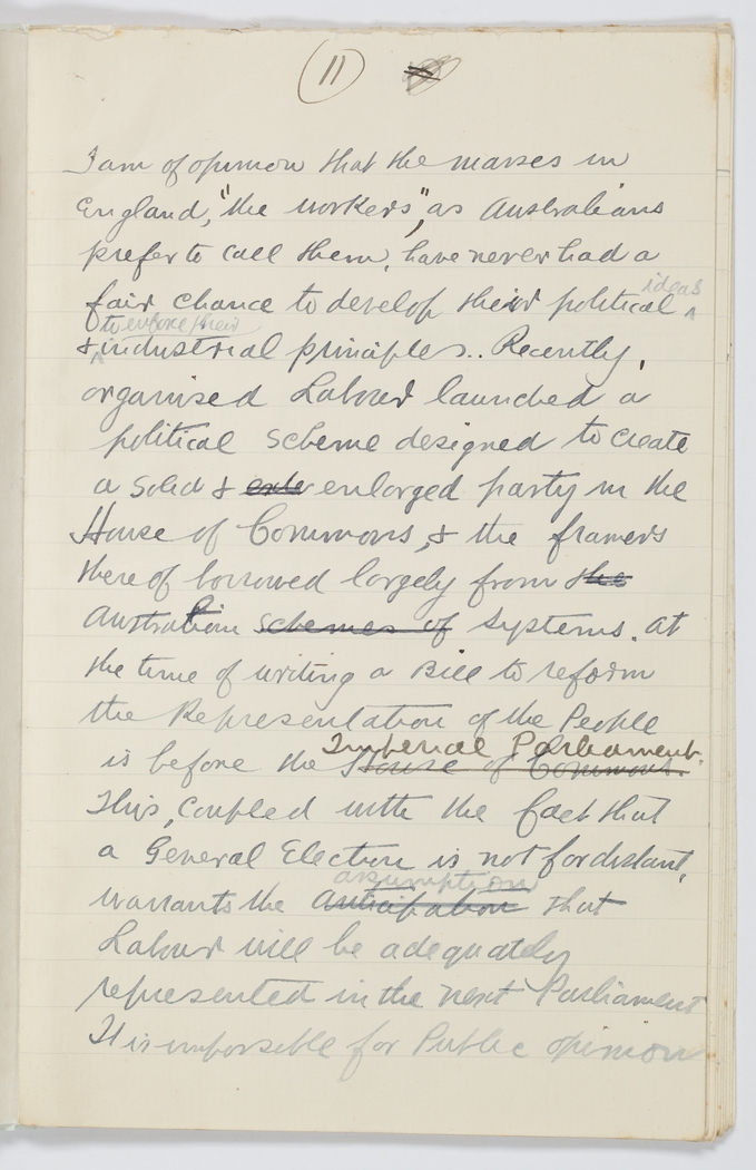 I am of opinion that the masses in England, "the workers", as Australians prefer to call them, have never had a fair chance to develop their political ideas & to enforce their industrial principles.. Recently, organised Labour launched a political scheme designed to create a solid & exte enlarged party in the House of Commons, & the farmers there of borrowed largely from the Australian schemes of Systems. At the time of writing a Bill to reform the Representation of the People is before the House of Commons Imperial Parliament. This, coupled with the fact that a General Election is not far distant, warrants the anticipation assumption that Labour will be adequately represented in the next Parliament. It is impossible for Public opinion