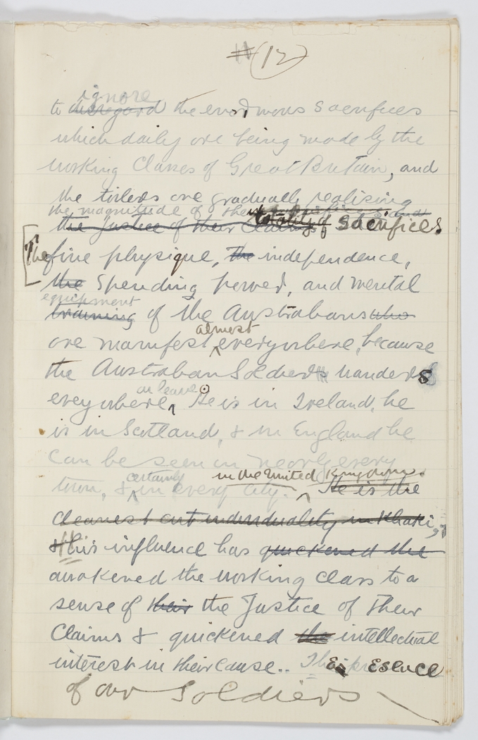 The fine physique, the  independence, the  spending power, and mental  training  equipment of the Australians  who  are manifest almost everywhere, because the Australian Soldiers  wanders everywhere on leave. He is in Ireland, he is in Scotland, & in England he can be seen in nearly every town, & certainly in every city in the United Kingdom.  He is the cleanest cut individuality in Khaki. His influence has  quickened the  awakened the working class to a sense of  their  the Justice of their claims & quickened  the  intellectual interest in their cause. The presence of our Soldiers