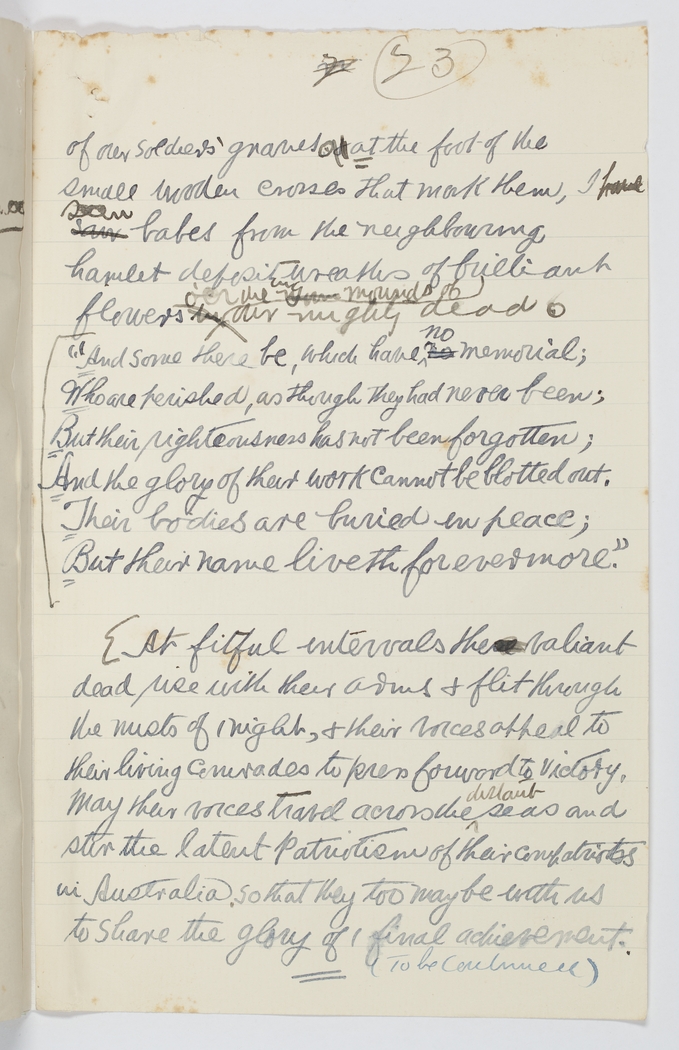At fitful intervals these valiant dead use with their arms & flit through the mists of 1 night, & their voices appeal to their living comrades to press forward to victory. May their voices travel across the distant seas and stir the latest patriotism of their compatriots in Australia, so that they too may be with us to share the glory of 1 final achievement.