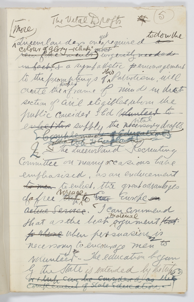 More Queenslanders are yet required to don the colour of glory Khaki - as reinforcements most urgently needed in fact, & a sympathetic encouragement to the promptings of this Patriotism, will create the proper frame of mind in that section of civil eligibles, whom the public consider shd Volunteer to enlist to s supply the necessary vital drafts.