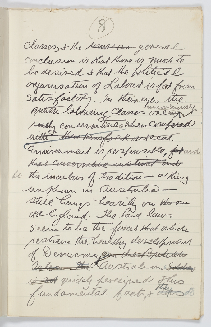 classes, & the universe general conclusion is that there is much to be desired & that the political organisation of Labour is far from satisfactory. In their eyes the British labouring classes are unconciously  really  conservatives  when compared with the Kinsfolk overseas.  Enviroment is responsible,  for  and  the's conservative instinct and  so the inculus of tradition - a thing unknown in Australia - still hangs heavily on  the on  old England. The land laws seem to be the forces  that  which  restrain the healthy development of Democracy  via the British Isles.  The  Australians  Soldier is not  quickly perceived this fundamental fact, &  does  they do