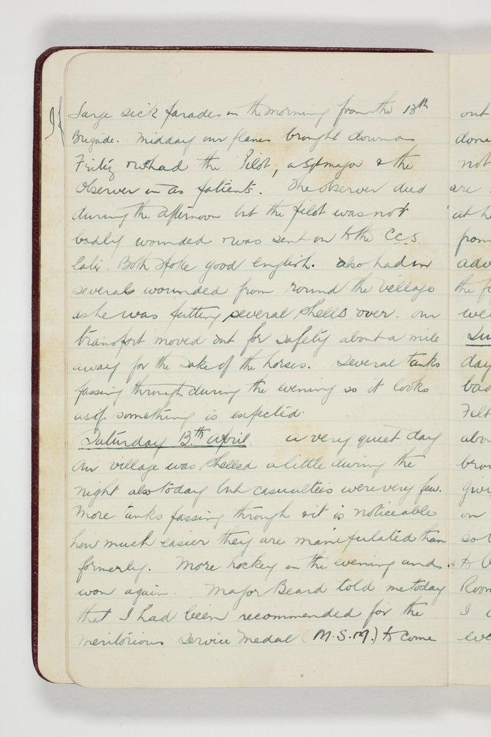 A very quiet day Our village was shelled a little during the night also today but casualties were very few. More tanks passing through & it is noticeable how much easier they are manipulated than formerly. More hockey in the evening and won again. Major Beard told me today that I had been recommended for the Meritorious Service Medal (M.S.M.) to come
