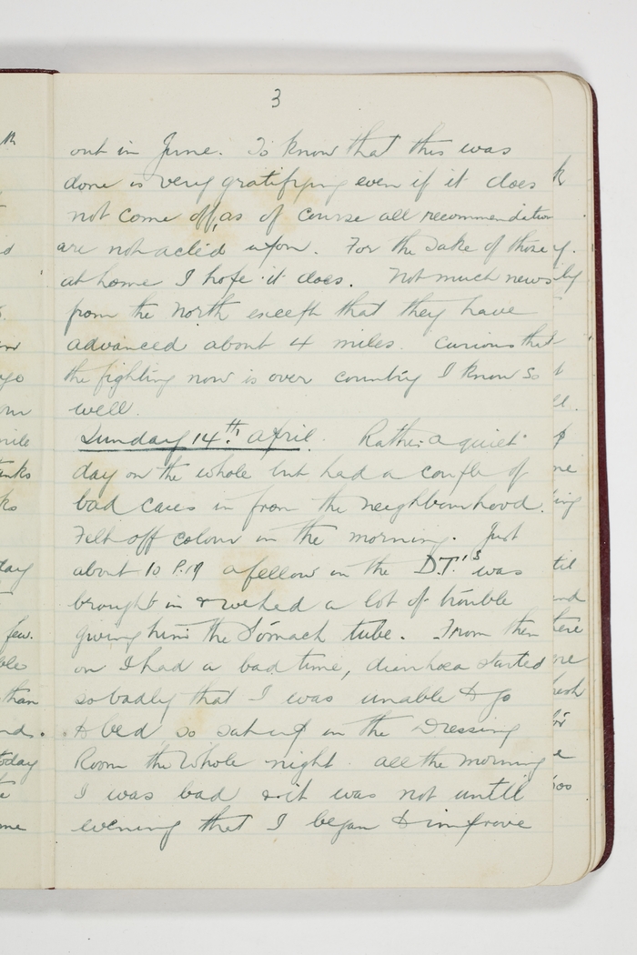 Rather a quiet day but had a couple of bad cases in from the neighbourhood. Felt off colour in the morning. Just about 10 PM a fellow in the D.T.'s was brought in & we had a lot of trouble giving him the Stomach tube. From then on I had a bad time, diarrhoea started so badly that I was unable to go to bed, so sat up in the Dressing Room the whole night. All the morning I was bad & it was not until evening that I began to improve