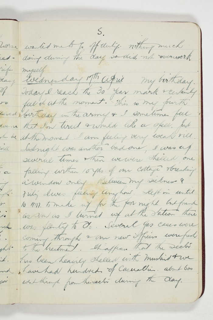 My birthday. Today I reach the 30 year mark & certainly feel it at the moment. This is my fourth birthday in the army & I sometimes feel that I'm tired & would like a spell. Just at the moment I am feeling very weak & ill. Last night was another bad one, I was up several times & then we were shelled, one falling within 10 yds of our cottage & breaking a window only. Between my sickness & Fritz I was feeling anyhow. Slept in until 10 AM. to make up for the poor night but found as soon as I turned up at the Station there was plenty to do. Several gas cases were coming through & our new officers were fresh to the treatment. It appears that the sector has been heavily shelled with mustard & we have had hundreds of casualties, about 600 went through from this sector during the day.