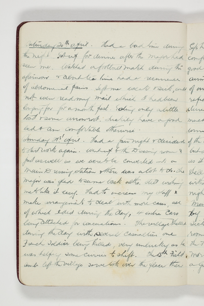 Had a fair night & decided to start work again. Went up to the Dressing room & just as well as we were to be converted into a Main Dressing station & there was a lot to do. The Major was glad to see me back although still wishing me to take it easy. Had to increase my staff & make arrangements to deal with more cases, all of which I did during the day, 4 extra cars being attached for evacuation. The village shelled during the day with several casualties, one French soldier being killed, very unlucky as he was helping some civvies to shift. The 15th Field Amb left the village so we took over the place their