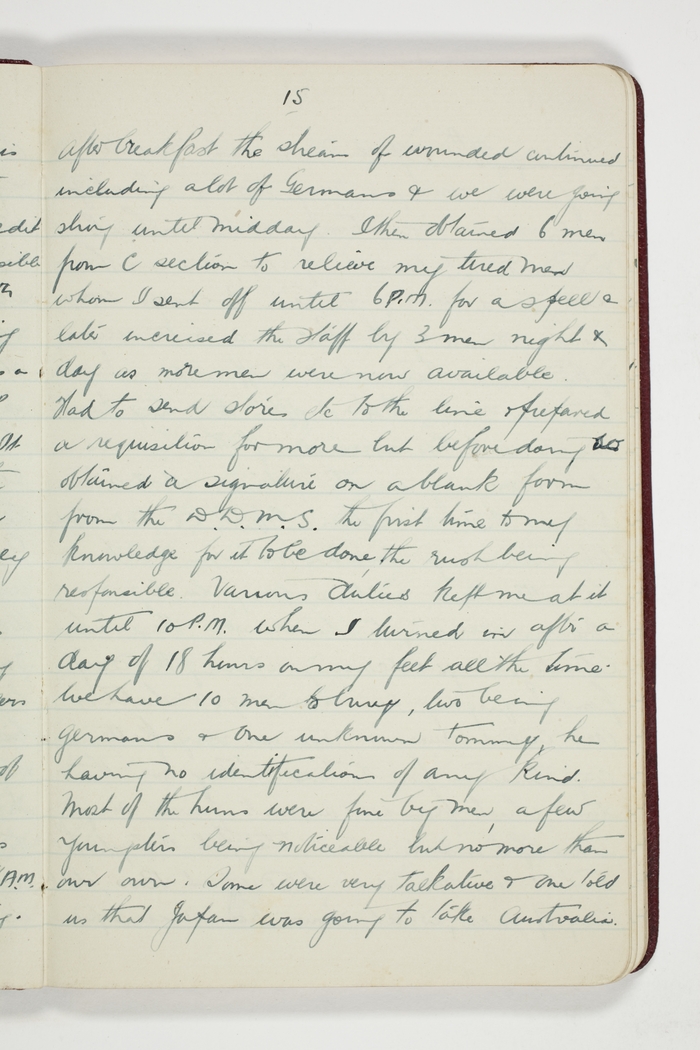 After breakfast the stream, of wounded continued including a lot of Germans & we were going strong until midday. I then obtained 6 men from C section to relieve my tired men whom I sent off until 6 P.M. for a spell & later increased the staff by 3 men night & day as more men were now available. Had to send stores to the line & prepared a requisition for more but before doing so obtained a signature on a blank form from the D.D.M.S. the first time to my knowledge for it to be done, the rush being responsible.
