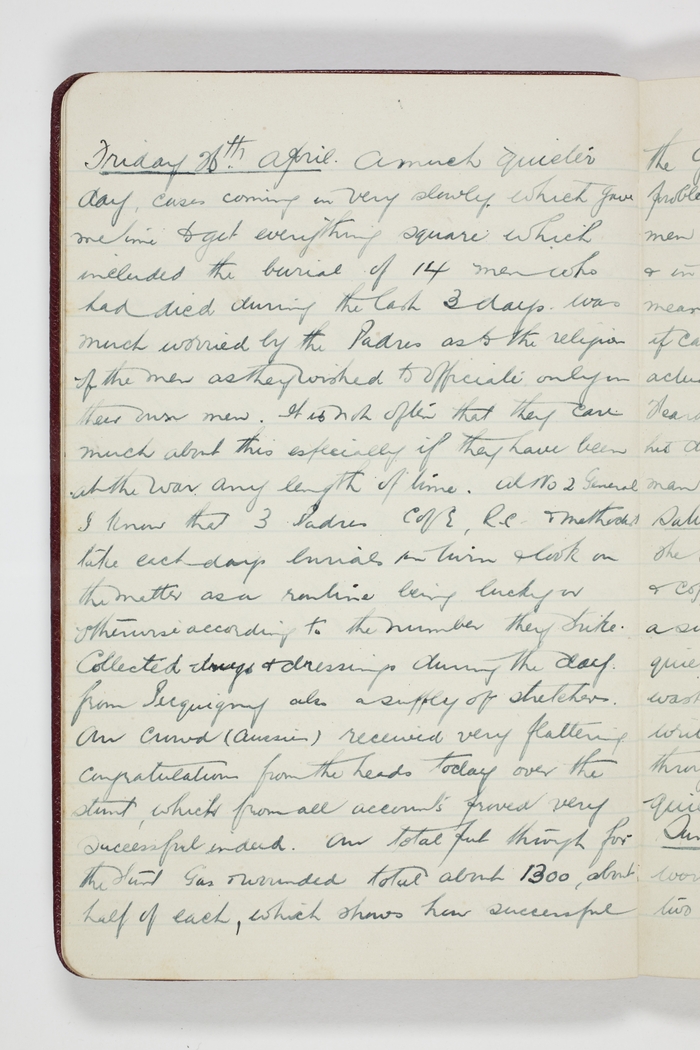 A much quieter day, cases coming in very slowly which gave me time to get everything square which included the burial of 14 men who had died during the last 3 days. Was much worried by the Padres as to the religion of the men as they wished to officiate only on their own men. It is not often that they care much about this especially if they have been at the war any length of time. At No 2 General I know that 3 Padres C of E, RC & Methodist take each days burials in turn & look on the matter as a routine being lucky or otherwise according to the number they strike.